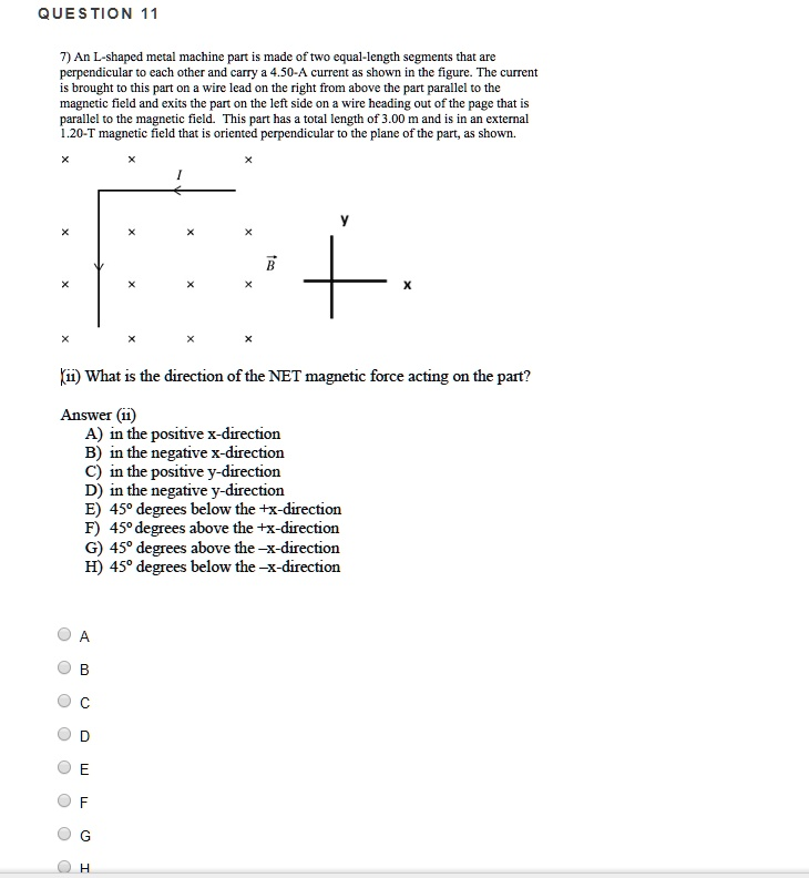 QUESTION 11 7) An L-shaped metal machine part made of two equal-length segments that are perpendicular to each other and carry 450- current as shown in the figure: The current enters this part on a wire lead on the right from above the part, parallel to the magnetic field, and exits the part on the left side on a wire heading out of the page, parallel to the magnetic field. This part has a total length of 3.00 m and is in an external 1.20- magnetic field that is oriented perpendicular to the plane of the part shown. Ki) What is the direction of the NET magnetic force acting on the part? Answer 8) in the positive x-direction in the negative x-direction in the positive y-direction D) in the negative Y-direction 45 degrees below the +x-direction 45 degrees above the +x-direction 45 degrees above the x-direction 45 degrees below the -x-direction