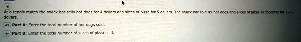 At a tennis match the snack bar sells hot dogs for 4 dollars and slices of pizza for 5 dollars. The snack bar sold 49 hot dogs and slices of pizza all together for $221 dollars. Part A: Enter the total number of hot dogs sold. Part B: Enter the total number of slices of pizza sold.