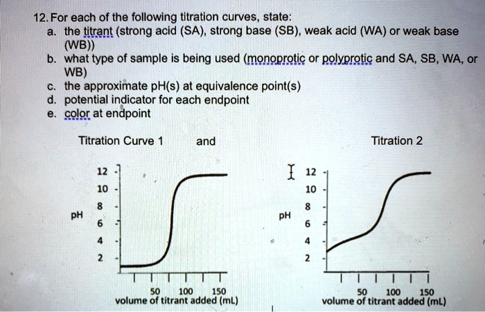 . For each of the following titration curves, state: the titrant (strong acid (SA), strong base (SB), weak acid (WA) or weak base (WB)), what type of sample is being used (monoprotic or polyprotic and SA, SB, WA, or WB), the approximate pH(s) at equivalence point(s), potential indicator for each endpoint, and color at endpoint. Titration Curve and Titration 2 pH 100 150 100 150 volume of titrant added (mL) volume of titrant added (mL)