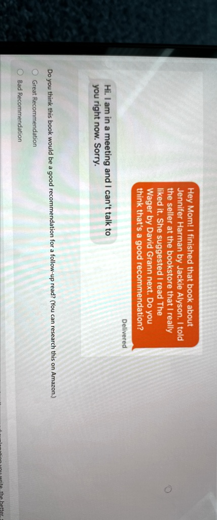 Hey Mom! I finished that book about Jennifer Harman by Jackie Alyson. I told the seller at the bookstore that I really liked it. She suggested I read The Wager by David Grann next. Do you think that’s a good recommendation? Hi. I am in a meeting and I can’t talk to you right now. Sorry. Delivered Do you think this book would be a good recommendation for a follow-up read? (You can research this on Amazon.) Great Recommendation Bad Recommendation