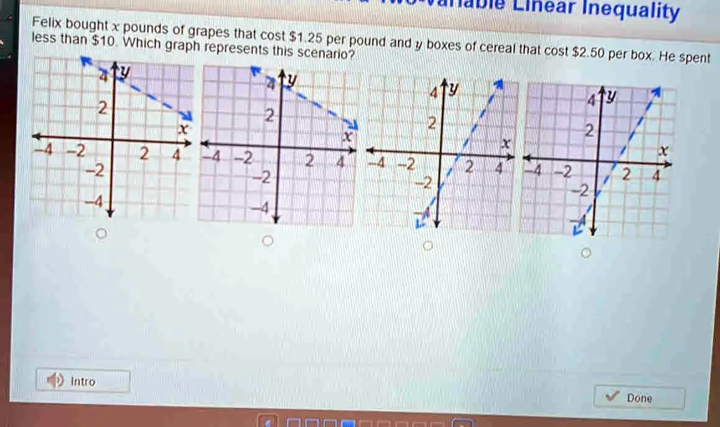 To determine the correct graph for the scenario, we begin by translating the situation into a mathematical inequality. Felix buys xx pounds of grapes at $1.25 per pound and yy boxes of cereal at $2.50 per box. Since his total spending is less than $10, we write the inequality: