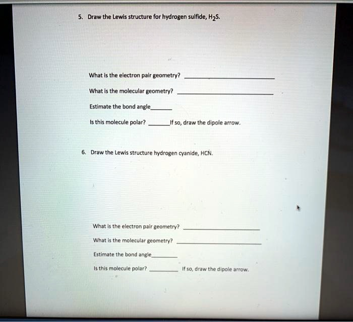 Draw the Lewis structure for hydrogen sulfide, H2S. What is the electron pair geometry? What is the molecular geometry? Estimate the bond angle. Is this molecule polar? If so, draw the dipole arrow. Draw the Lewis structure for hydrogen cyanide, HCN. What is the electron pair geometry? What is the molecular geometry? Estimate the bond angle. Is this molecule polar? If so, draw the dipole arrow.