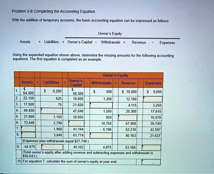 To solve Equation 7 and calculate the owner’s equity at year end, we will apply the expanded accounting equation: Assets=Liabilities+Owner’s Capital+Revenues−Expenses−Withdrawals\text{Assets} = \text{Liabilities} + \text{Owner’s Capital} + \text{Revenues} – \text{Expenses} – \text{Withdrawals}