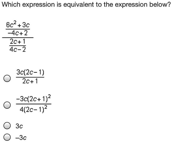 Which expression is equivalent to the expression below? \frac{6c^2 + 3c}{-4c + 2} \frac{2c + 1}{4c – 2} \frac{3c(2c – 1)}{2c + 1} \frac{-3c(2c + 1)^2}{4(2c – 1)^2} 3c -3c