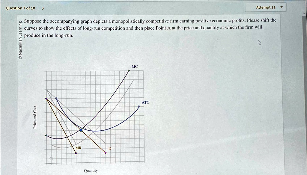Question 7 of 10 no Suppose the accompanying graph depicts a monopolistically competitive firm earning positive economic profits. Please shift the curves to show the effects of long-run competition and then place Point A at the price and quantity at which the firm will produce in the long-run. Quantity Question 7of10 Attempt 11 Suppose the accompanying graph depicts a monopolistically competitive firm earning positive economic profits. Please shift the curves to show the effects of long-run competition and then place Point A at the price and quantity at which the firm will produce in the long-run. Macmillan MC ATC Price and Cost MR Quantity