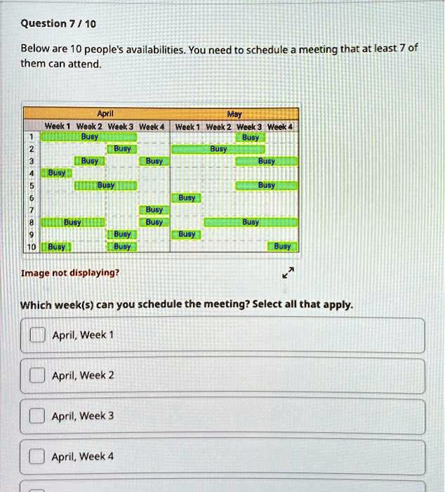 Below are 10 people’s availabilities. You need to schedule a meeting that at least 7 of them can attend. April May Week 1 Week 2 Week 3 Week 4 Week 1 Week 2 Week 3 Week 4 Buey BUSI Busy Busy Busy Busy BUSY BUSY BUSY BUSY BUS Image not displaying? Which week(s) can you schedule the meeting? Select all that apply: April, Week 1 April, Week 2 April, Week 3 April, Week 4