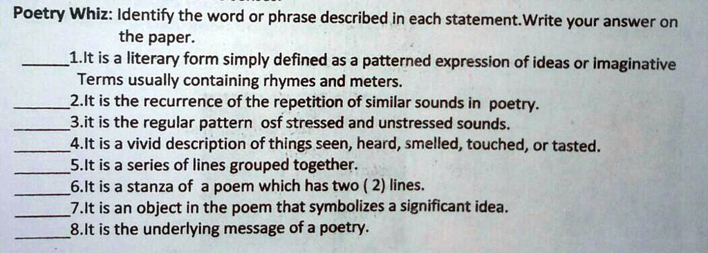 It is a literary form simply defined as a patterned expression of ideas or imaginative terms usually containing rhymes and meters. 2. It is the recurrence of similar sounds in poetry. 3. It is the regular pattern of stressed and unstressed sounds. 4. It is a vivid description of things seen, heard, smelled, touched, or tasted. 5. It is a series of lines grouped together. 6. It is a stanza of a poem which has two (2) lines. 7. It is an object in the poem that symbolizes a significant idea. 8. It is the underlying message of a poem
