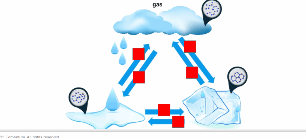 In the provided diagram, we observe the water cycle and the different states of matter: gas (clouds), liquid (water droplets or puddle), and solid (ice). When a gas turns into a liquid, it undergoes condensation. This happens when water vapor in the air cools down and loses energy. The particles slow down and come closer together, forming liquid water. This is represented by the downward arrow from the cloud to the falling droplets.