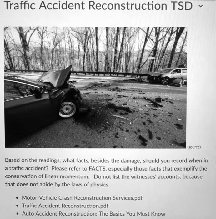 Traffic Accident Reconstruction TSD (source) Based on the readings, what facts, besides the damage, should you record when in a traffic accident? Please refer to FACTS, especially those facts that exemplify the conservation of linear momentum. Do not list the witnesses’ accounts because that does not abide by the laws of physics. Motor-Vehicle Crash Reconstruction Services PDF Traffic Accident Reconstruction PDF Auto Accident Reconstruction: The Basics You Must Know