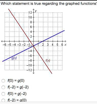 Which statement is true regarding the graphed functions? 12 y 10 8 6 4 2 -6 -5 -4 -3 -2 -1 1 2 3 4 5 6 x -2 -4 -6 g(x) -8 f(x) -10 -12 f(0) = g(0) f(-2) = g(-2) f(0) = g(-2) f(-2) = g(0)