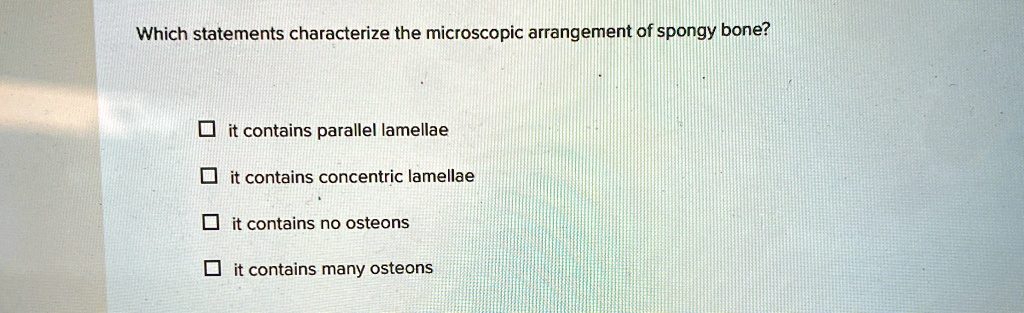 Which statements characterize the microscopic arrangement of spongy bone? ? it contains parallel lamellae ? it contains concentric lamellae ? it contains no osteons ? it contains many osteons