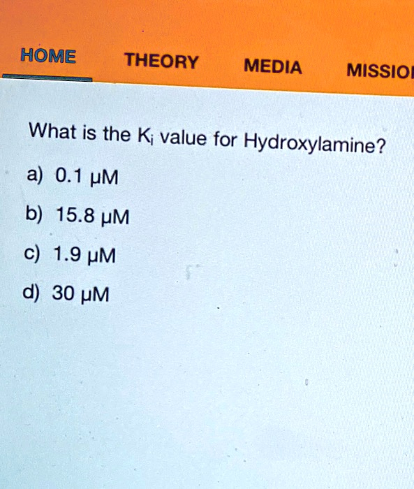 HOME THEORY MEDIA MISSION What is the K value for Hydroxylamine? a) 0.1 pM b) 15.8 pM c) 1.9 pM d) 30 pM