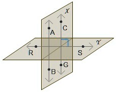 2. Line CG lies in a different vertical plane (Plane YZ), but also appears to be a vertical line because C and G are aligned vertically. However, they lie in a plane that intersects Plane XZ at a right angle (as shown by the small blue square indicating perpendicular planes).