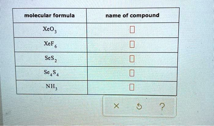 Molecular formula Name of compound XeO2 XeF2 SeS2 Se4S4 Ni