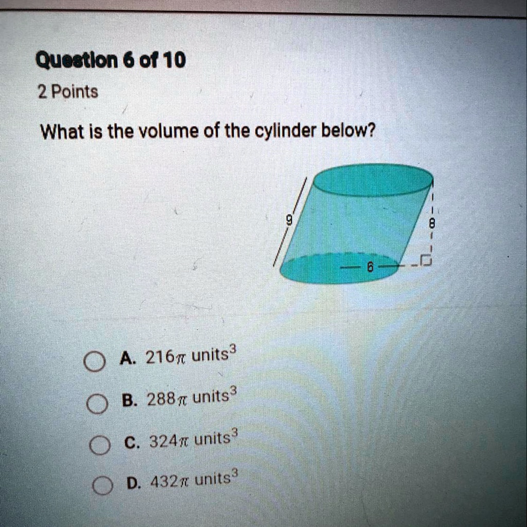Question 6 of 10 2 Points What is the volume of the cylinder below? A.