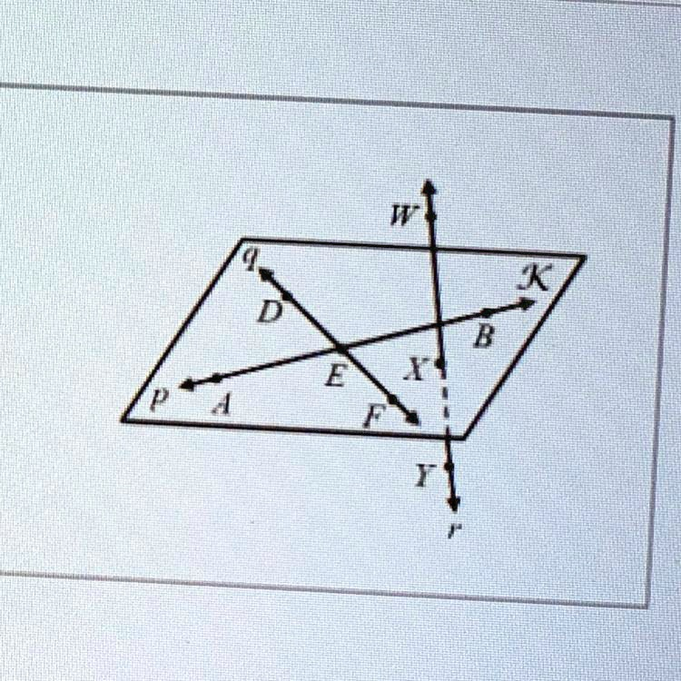 A point is non-coplanar if it does not lie on the same plane. Plane K includes all the points forming the parallelogram (like A, B, D, E, F, etc.). Point W, however, lies above the plane (as line r is perpendicular or slanted relative to the plane), making it non-coplanar. Points on a line intersecting a plane but not lying in it (like W) are outside that plane.