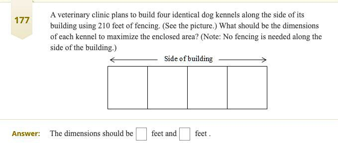veterinary clinic plans to build four identical dog kennels along the side of its building using 210 feet of fencing. (See the picture.) What should be the dimensions of each kennel to maximize the enclosed area? (Note: No fencing is needed along the side of the building.) Side of building Answer: The dimensions should be feet and feet.