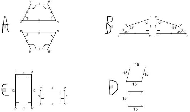 Upon closer inspection, none of the sets show fully congruent shapes—but D is the closest, since both shapes have the same side lengths.