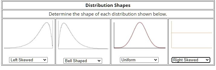 Distribution Shapes Determine the shape of each distribution shown below. Left Skewed Bell Shaped Uniform Right Skewed