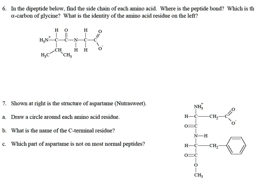 In the dipeptide below, find the side chain of each amino acid. Where is the peptide bond? Which is the γ-carbon of glycine? What is the identity of the amino acid residue on the left? H3N+-C-C-C-C-C-COO- | | | | | | H H H H H H Shown at right is the structure of aspartame (Nutrasweet). NH2 Draw a circle around each amino acid residue. H -CH2 O=C What is the name of the C-terminal residue? NH2 Which part of aspartame is not in most normal peptides? H O CH3 -CH2