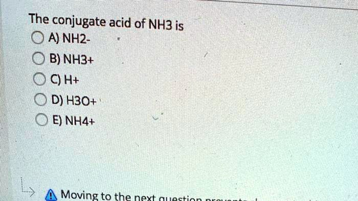 - D) H₃O⁺: This is the hydronium ion, formed when water gains a proton. It is unrelated to the conjugate acid of NH₃.