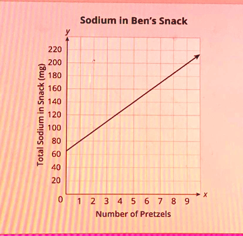 The graph titled “Sodium in Ben’s Snack” displays a linear relationship between the number of pretzels (x-axis) and the total sodium in the snack (y-axis) measured in milligrams (mg). To understand the pattern and find the rule or equation that governs the graph, we must analyze key points and the nature of the line.