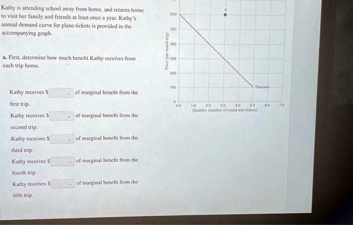 Kathy is attending school away from home, and returns home to visit her family and friends at least once a year. Kathy’s annual demand curve for plane tickets is provided in the accompanying graph. a. First, determine how much benefit Kathy receives from each trip home. Kathy receives