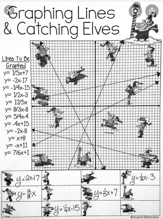 To solve the “Graphing Lines & Catching Elves” activity, we need to match each linear equation from the list on the left with the elves shown on the graph, based on the lines they are sitting or standing on. The matching is done by plotting the lines from the equations and identifying which elf lies on each line.