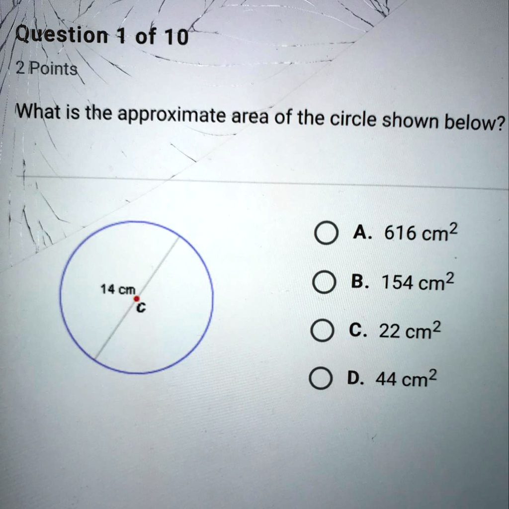 Question 1 of 10 2 Points What is the approximate area of the circle shown below? A. 616 cm