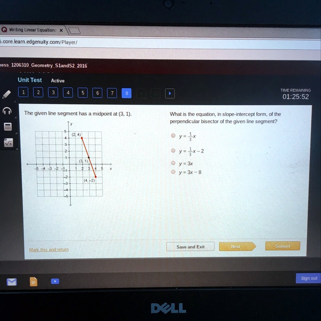 The given line segment has a midpoint at (3,1). What is the equation, in slope-intercept form, of the perpendicular bisector of the given line segment? Writing Linear Equation: corelearn.edgenuity.com/Player/ ess 1206310 Geometry SlandS2 2016 Unit Test Active TIME REMAINING 01:25:52 The given line segment has a midpoint at (3,1). What is the equation, in slope-intercept form, of the perpendicular bisector of the given line segment? Y = y = ix-2 y = 3x y = 3x – 8 Save and Exit Next Submit Mark this and return Sign out DeLL