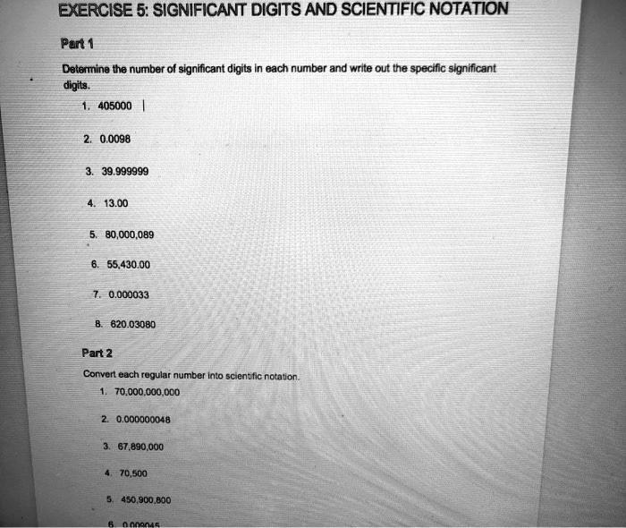 Significant Digits and Scientific Notation Part 1 Determine the number of significant digits in each number and write out the specific significant digits: 405,000 0.0098 39.999999 13.00 80,000,089 55,430.00 0.000033 620.03080 Part 2 Convert each regular number into scientific notation: 70,000,000 0.000000048 67,890,000 70,500 450,900,810