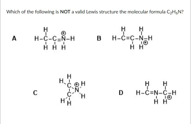 Final Answer: ✅ A is NOT a valid Lewis structure because it violates the octet rule for carbon, making it chemically implausible despite matching the molecular formula C₂H₆N.