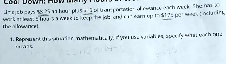 10 of transportation allowance each week. She has to work at least 5 hours a week to keep the job, and can earn up to $175 per week (including the allowance). 1. Represent this situation mathematically. If you use variables, specify what each one means