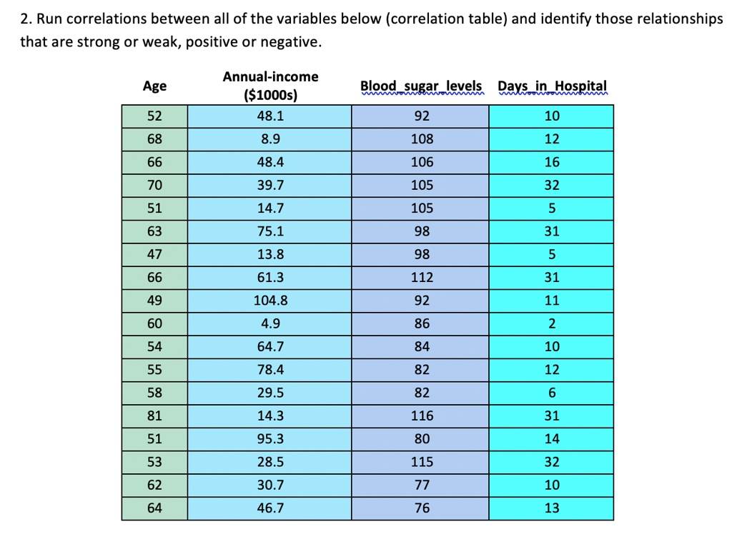 Run correlations between all of the variables below (correlation table) and identify those relationships that are strong or weak, positive or negative. Annual-income Age ($1000s) Blood_sugar levels Days in Hospital 52 48.1 92 10 68 8.9 108 12 66 48.4 106 16 70 39.7 105 32 51 14.7 105 5 63 75.1 98 31 47 13.8 98 5 66 61.3 112 31 49 104.8 92 11 60 4.9 86 2 54 64.7 84 10 55 78.4 82 12 58 29.5 82 6 81 14.3 116 31 51 95.3 80 14 53 28.5 115 32 62 30.7 77 10 64 46.7 76 13