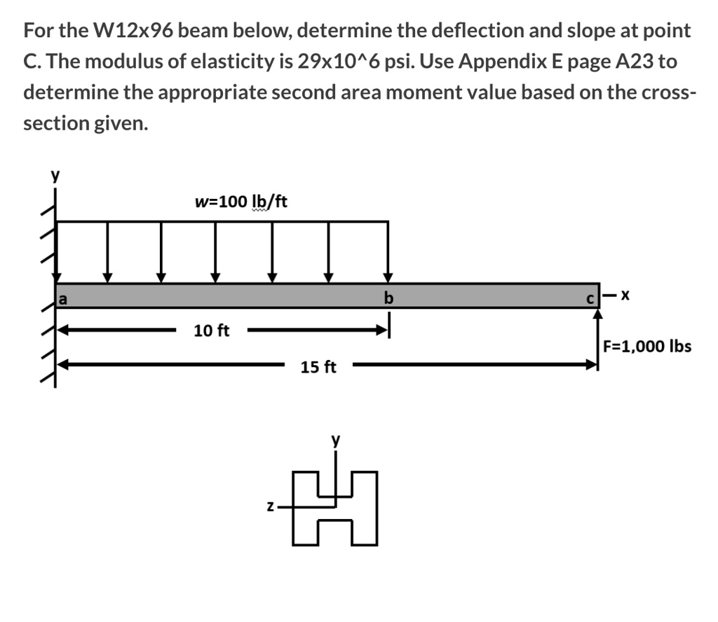 For the W12x96 beam below, determine the deflection and slope at point C.