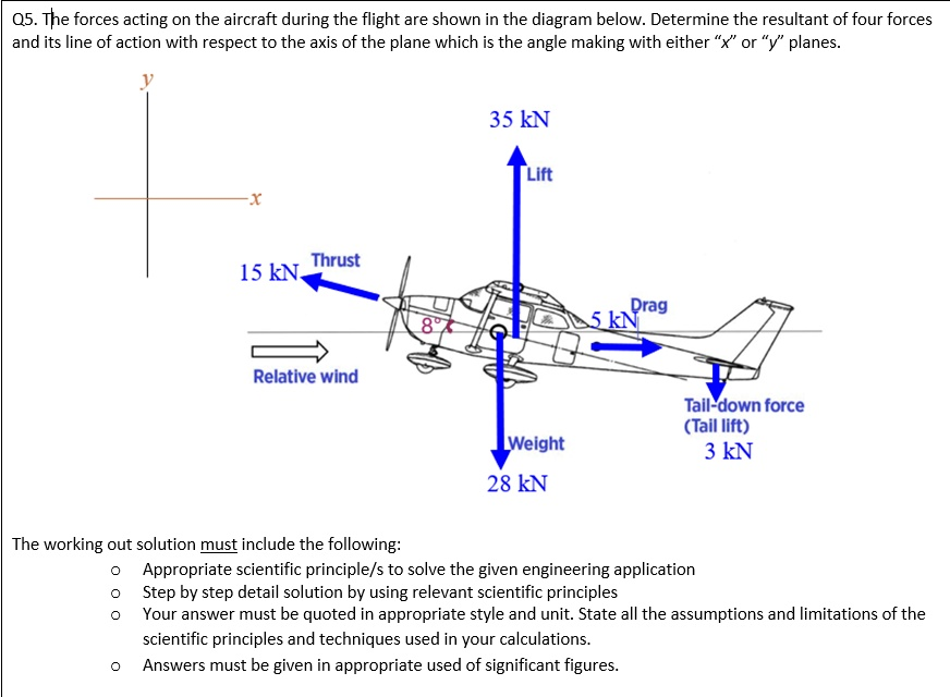 Drag 5 kN Relative wind Weight 28 kN Tail-down force (Tail lift) 3 kN The working out solution must include the following: \circ Appropriate scientific principle/s to solve the given engineering application \circ Step by step detail solution by using relevant scientific principles \circ Your answer must be quoted in appropriate style and unit. State all the assumptions and limitations of the scientific principles and techniques used in your calculations. \circ Answers must be given in appropriate used of significant figures.