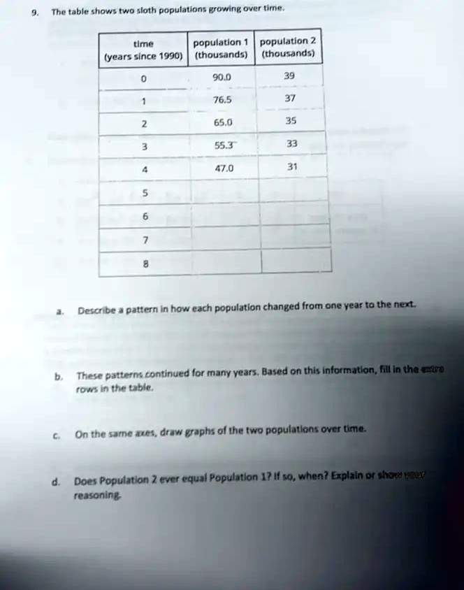 The table shows two sloth populations growing over time. time population 1 population 2 (years since 1990) (thousands) (thousands) 0 90.0 39 1 76.5 37 2 65.0 35 3 55.3 33 4 47.0 31 5 6 7 8 a. Describe a pattern in how each population changed from one year to the next. b. These patterns continued for many years. Based on this information, fill in the extra rows in the table. c. On the same axes, draw graphs of the two populations over time. d. Does Population 2 ever equal Population 1? If so, when? Explain or show your reasoning.