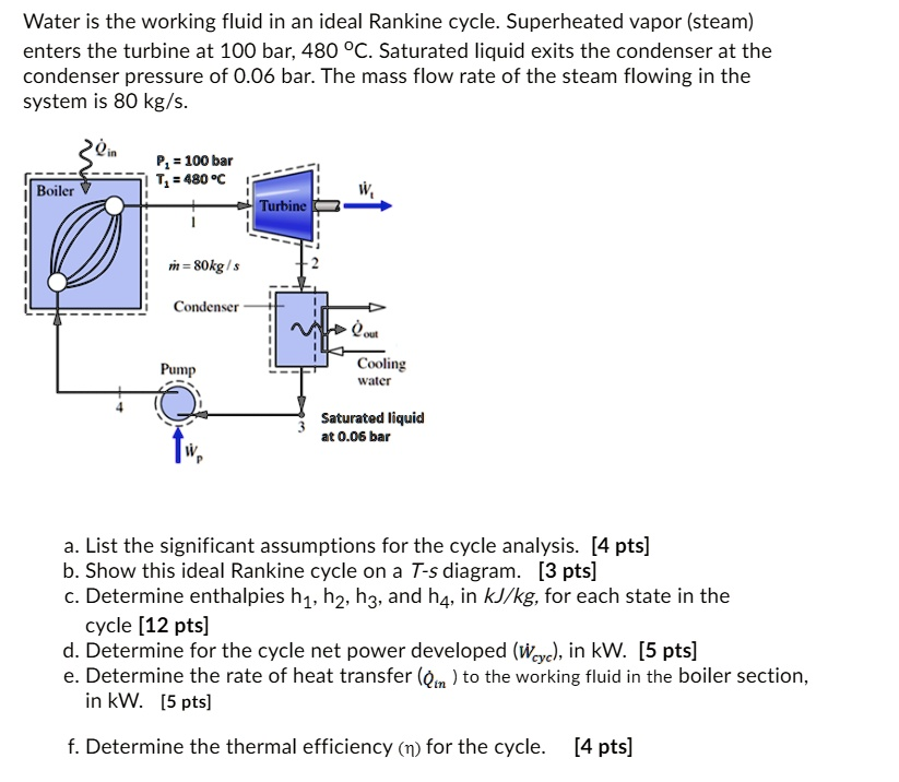 Water is the working fluid in an ideal Rankine cycle. Superheated vapor (steam) enters the turbine at 100 bar and 480°C. Saturated liquid exits the condenser at a pressure of 0.06 bar. The mass flow rate of the steam flowing in the system is 80 kg/s. P = 100 bar T = 480°C Boiler Turbine 1 m = 80 kg/s Condenser Pump Cooling water Saturated liquid at 0.06 bar a. List the significant assumptions for the cycle analysis. [4 pts] b. Show this ideal Rankine cycle on a T-s diagram. [3 pts] c. Determine enthalpies h1, h2, h3, and h4, in kJ/kg, for each state in the cycle. [12 pts] d. Determine the net power developed (wiyc) for the cycle, in kW. [5 pts] e. Determine the rate of heat transfer (Qim) to the working fluid in the boiler section, in kW. [5 pts] f. Determine the thermal efficiency (n) for the cycle. [4 pts]