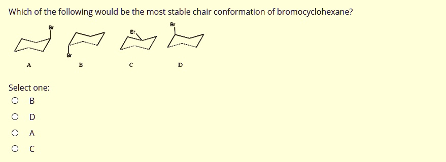 - Structure C: The bromine atom is in an axial position, pointing straight up. Similar to B, this conformation is destabilized by 1,3-diaxial interactions.