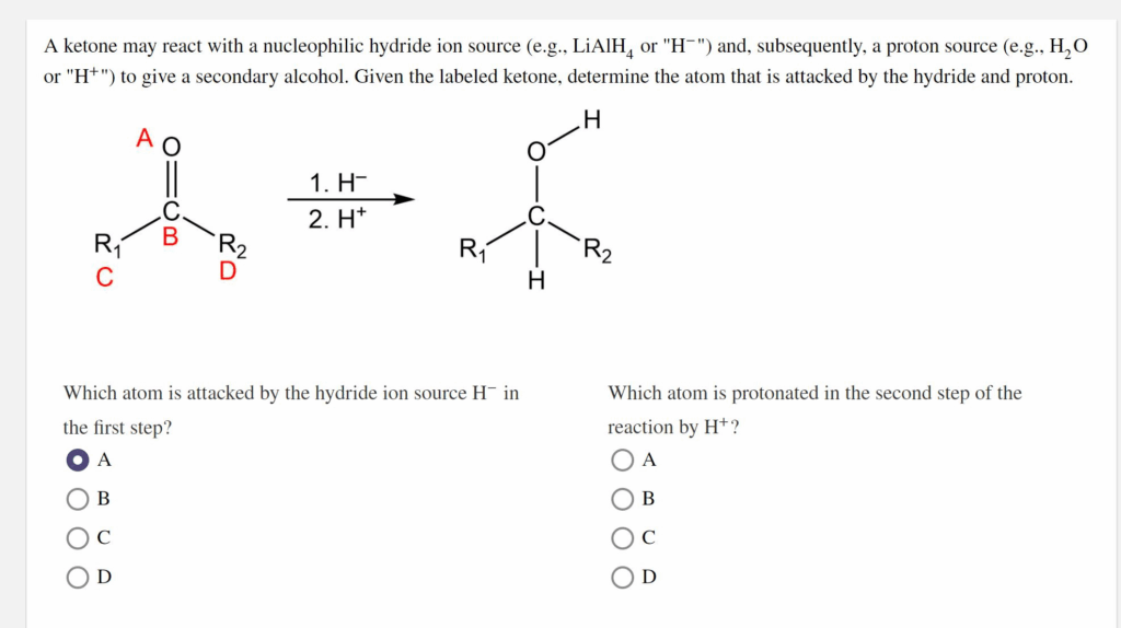 - The Attack: Therefore, the nucleophilic hydride ion (H⁻) will attack the electron-deficient carbonyl carbon, atom B. As the new C-H bond forms, the weaker pi (π) bond of the C=O double bond breaks, and the pair of electrons moves onto the electronegative oxygen atom (A). This step results in the formation of a tetrahedral intermediate called an alkoxide ion.