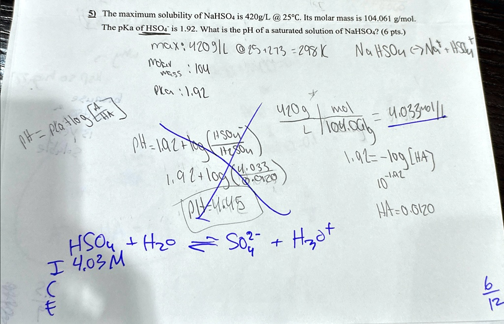Based on the red ink corrections, solve. The maximum solubility of NaHSO4 is 420 g/L @ 25°C. Its molar mass is 104.061 g/mol. The pKa of HSO4^- is 1.92. What is the pH of a saturated solution of NaHSO4? (6 pts.) Plan: 1.92 The maximum solubility of NaHSO4 is 420 g/L @ 25°C. Its molar mass is 104.061 g/mol. The pKa of HSO4^- is 1.92. What is the pH of a saturated solution of NaHSO4? (6 pts.) max: 420 g/L @ 25°C Prc: 1.92 420 g/mol x 1 mol/104.061 g = 4.033 mol/L SO4^-2 + H2O -> HSO4^- + OH^- 1.92 = -log([HSO4^-]/[SO4^-2]) 1.92 = -log(4.033/x) x = 0.033 M pH = 1/2(pKa - log([A-]/[HA])) pH = 1/2(1.92 - log(0.033/4.033)) pH = 1/2(1.92 - 1.39) pH = 0.265