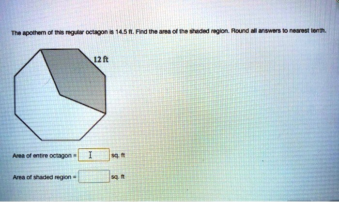 The apothem of this regular octagon is 14.5 ft. Find the area of the shaded region. Round all answers to the nearest tenth. 12 ft Area of entire octagon Area of shaded region