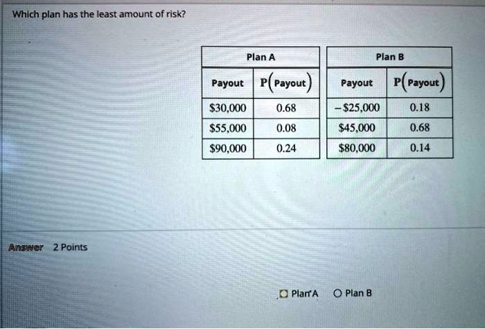 Which plan has the least amount of risk? Plan A Plan B Payout P (Payout) Payout P (Payout)