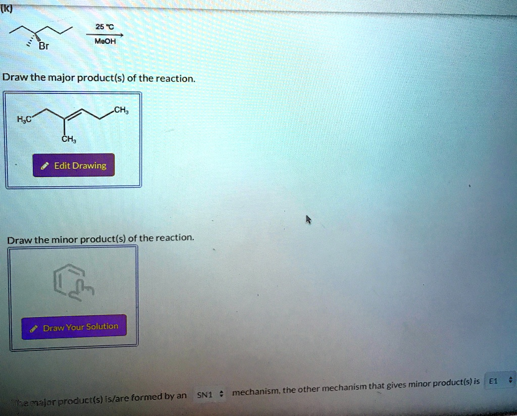 Edit Drawing Draw the minor product(s) of the reaction. Draw Your Solution The major product(s) is/are formed by an SN1 mechanism, the other mechanism that gives minor product(s) is E1