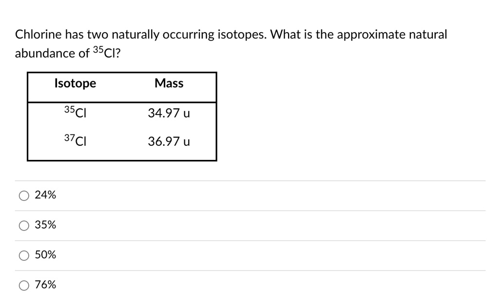 Chlorine has two naturally occurring isotopes. What is the approximate natural abundance of