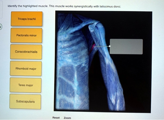Identify the highlighted muscle. This muscle works synergistically with latissimus dorsi. Triceps brachii Pectoralis minor Coracobrachialis Rhomboid major Teres major Subscapularis Reset Zoom