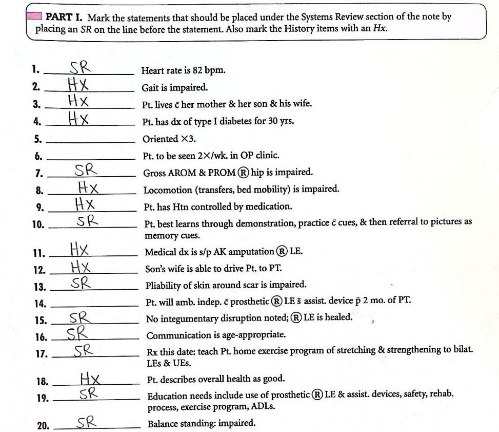 Mark the statements that should be placed under the Systems Review section of the note by placing an SR on the line before the statement. Also mark the History items with an Hx. 1. 2. 3. 4. 5. 6. 7. 8. 9. SR Hx Hx XH Heart rate is 82 bpm. Gait is impaired. Pt. lives with her mother & her son & his wife. Pt. has dx of type I diabetes for 30 yrs. Oriented X3. Pt. to be seen 2X/wk. in OP clinic. Gross AROM & PROM hip is impaired. Locomotion (transfers, bed mobility) is impaired. SR Hx Hx SR Pt. has Htn controlled by medication. Pt. best learns through demonstration, practice cues, & then referral to pictures as memory cues. Medical dx is s/p AK amputation LE. Son’s wife is able to drive Pt. to PT. Pliability of skin around scar is impaired. Pt. will amb. indep. C prosthetic LE s assist. device p 2 mo. of PT. No integumentary disruption noted; LLE is healed. Communication is age-appropriate. Rx this date: teach Pt. home exercise program of stretching & strengthening to bilateral LEs & UEs. Pt. describes overall health as good. Education needs include use of prosthetic LE & assist. devices, safety, rehab. process, exercise program, ADLs. Balance standing: impaired. 10. Hx Hx SR 11. 12. 13. 14. 15. 16. 17. SR SP SR XH SR 18. 19. SR 20.