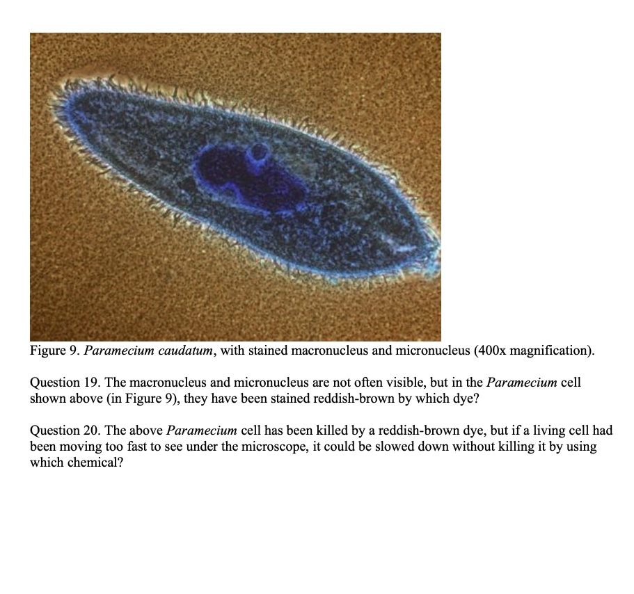 Paramecium caudatum, with stained macronucleus and micronucleus (400x magnification) Question 19. The macronucleus and micronucleus are not often visible, but in the Paramecium cell shown above (in Figure 9), they have been stained reddish-brown by which dye? Question 20. The above Paramecium cell has been killed by a reddish-brown dye, but if a living cell had been moving too fast to see under the microscope, it could be slowed down without killing it by using which chemical?
