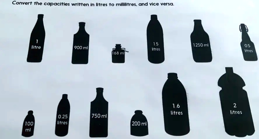 Convert the capacities written in litres to millilitres, and vice versa. 1 litre 900 ml 1.5 litres 1250 ml 0.5 litres 168 ml 1.6 litres 2 litres 100 ml 0.25 litres 750 ml 200 ml