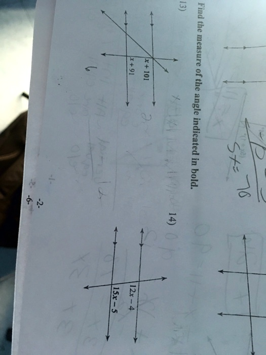 Find the measure of the angle indicated in bold. 13) x + 101 16 + x 14) 12x – 4 15x – 5
